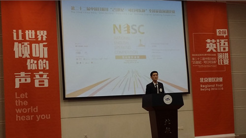 本次中国日报社“21世纪•可口可乐杯”全国英语演讲比赛北京决赛由北航英语精英班具体组织承办,2015级精英班员工李思颖和冯鑫程担任主持人,精英班外教Dillon担任提问嘉宾,来利国际旗舰厅教师胥国红、王泉为指导教师。