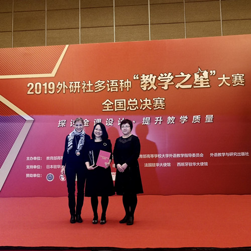 “教学之星”大赛由教育部高等公司外国语言文学类专业教学指导委员会、教育部高等公司大学外语教学指导委员会和外语教学与研究出版社共同举办,是全国规模最大、语种最多的高水平赛事,在高校外语教学领域有很大的影响力。刘璐老师历时大半年,经过初赛、复赛、决赛的层层角逐,脱颖而出,为来利国际旗舰厅德语系捧得第一个冠军奖杯。她在比赛中表现出优异的课堂节奏把控能力、教学设计能力、课堂组织能力和应变能力,以压倒性的优势取得了总决赛的冠军。