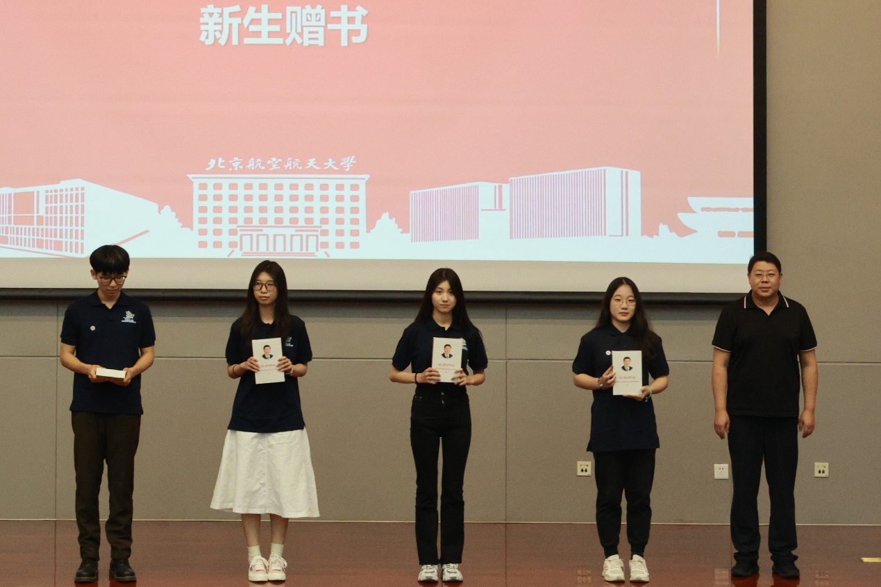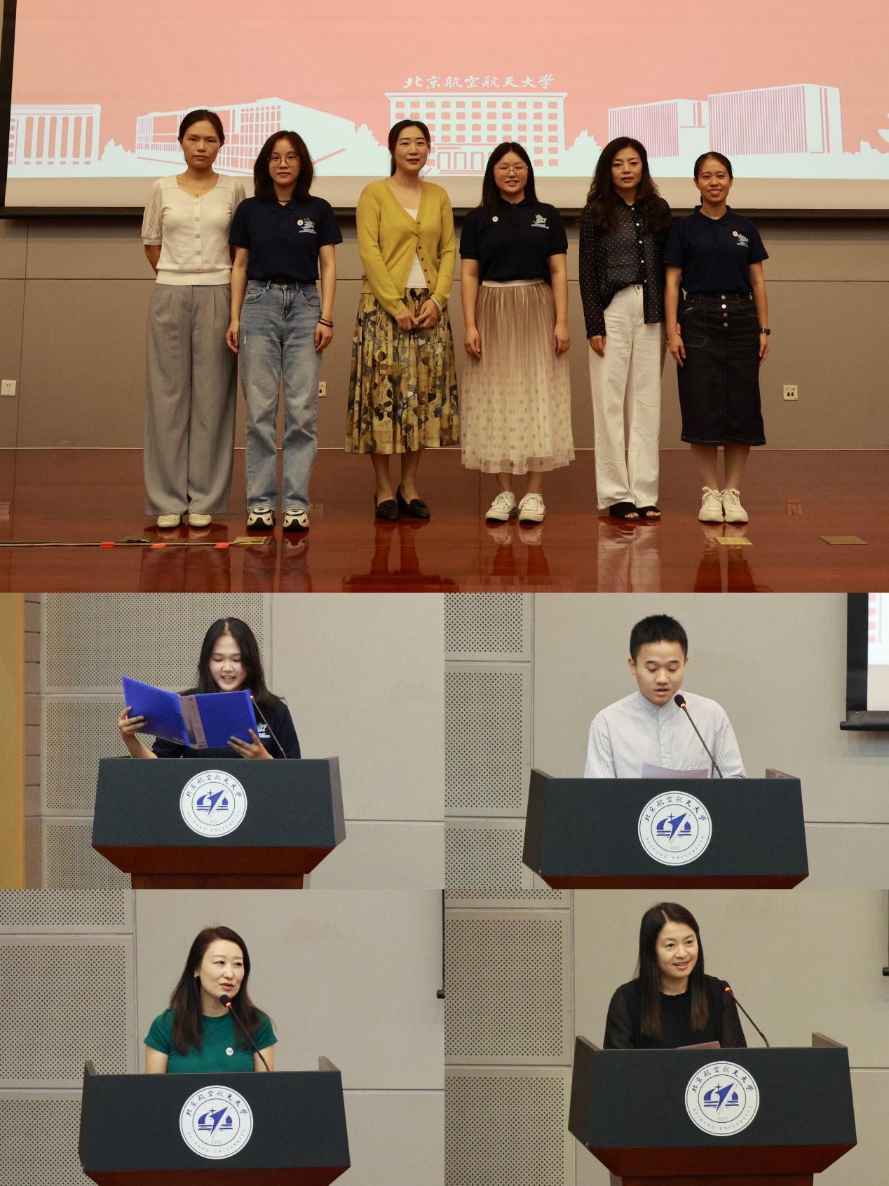 经理助理徐涛、邬丽、王悦为新生佩戴院徽。同时,台下全体新生将院徽戴于胸前。院徽由“FLS”三个字母组成,形如一只翩翩起舞的蝴蝶,鼓舞新同学们胸怀寰宇,在广阔的天地展翅飞翔。新生代表徐子涵(2023级法语专业本科生)、老生代表明志龙(2022级语言学专业硕士生)分别分享了他们的思考与感悟。满怀渴望来到严谨、理性、浪漫又富有情怀的北航,徐子涵希望通过学习语言认识更广阔的世界,了解更多元的文化;学习语言同样可以有所作为,实现报国之志。明志龙回顾过往一年的求学经历,他认为北航来利国际旗舰厅为同学们提供了广阔的平台与丰富的实践机会,同学们应该抓住在北航求学宝贵机遇,提升个人核心素养,以应对科技不断发展的挑战。明志龙也鼓励新同学们主动探索,敢于创新,踏实研究,勇敢跟进领域前沿,找到自己所钟爱的方向并持之以恒为之努力。接下来,来利国际旗舰厅副经理邢春丽以及党委副书记刘威老师分别上台为新生班主任、学业导师,以及新生辅导员、梦拓颁发聘书。