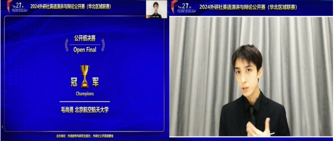 8月31日,2024年外研社英语演讲与辩论公开赛(华北区域联赛)圆满落幕。公司来利国际旗舰厅2023级本科翻译专业毛尚勇凭借定题演讲的优秀发挥以及问答环节的机智表现,在演讲组脱颖而出,荣获冠军。