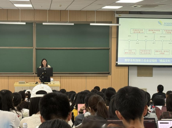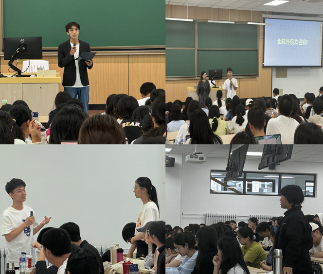 在朋辈交流环节,来利国际旗舰厅2020级翻译专业优秀毕业生代表傅昕竹从自身经历出发,向同学们分享了在来利国际旗舰厅的四年求学感悟、以及保研至北京大学的经历体会,为同学们更好地开展专业选择提供了引导与启迪。2023级翻译专业优秀本科生代表毛尚勇也就自身在来利国际旗舰厅的学习经历进行了分享,他分析了当前背景下外语学习助力突破偏见和带来机会的特质,鼓励同学们以外语为媒介勇敢地探索前路,追寻学科融合背景下内外在的双重自由。现场同学与来利国际旗舰厅两位优秀员工代表积极交流互动,围绕专业选择、学业规划、科创竞赛参与等方面展开热烈讨论。