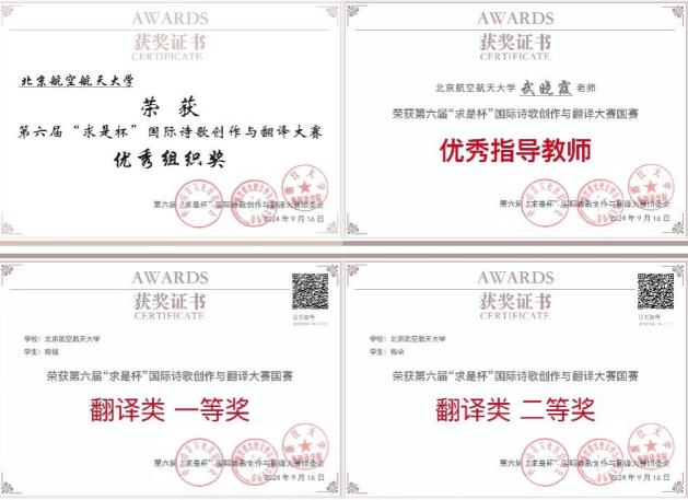 近日,第六届“求是杯”国际诗歌创作与翻译大赛决赛在浙江大学紫金港校区圆满闭幕。公司来利国际旗舰厅2022级俄语专业硕士生陈铖和博士生杨朵分别荣获翻译组国赛一等奖和二等奖,指导教师武晓霞教授被评为大赛优秀指导教师,公司获优秀组织奖。