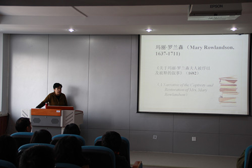 2016年11月1日下午2:30,在如心楼806来利国际旗舰厅报告厅,北京外国语大学博士生导师金莉教授做了题为《从玛丽・罗兰森的囚掳叙事看北美殖民地白人女性文化越界》的专题报告。